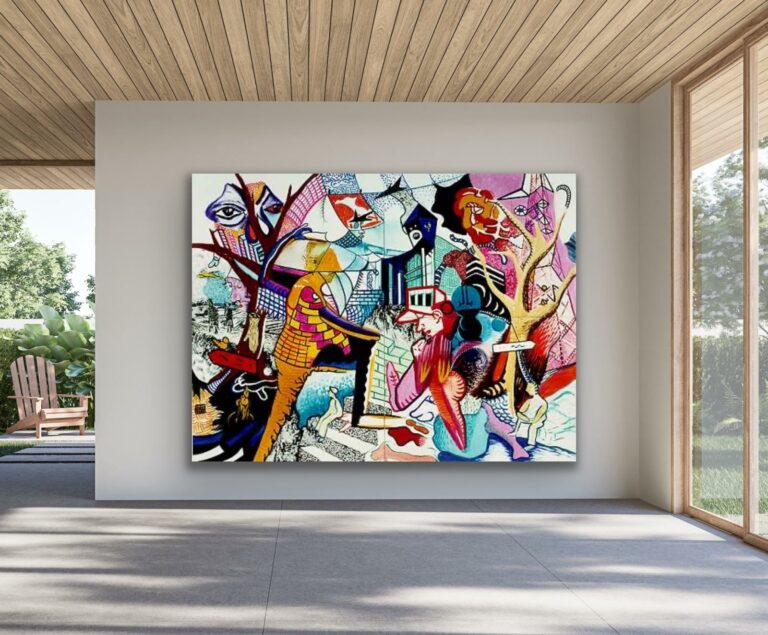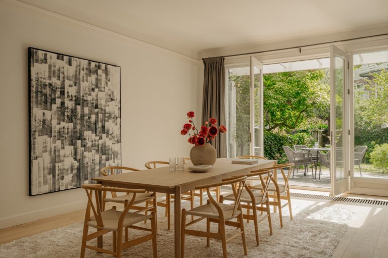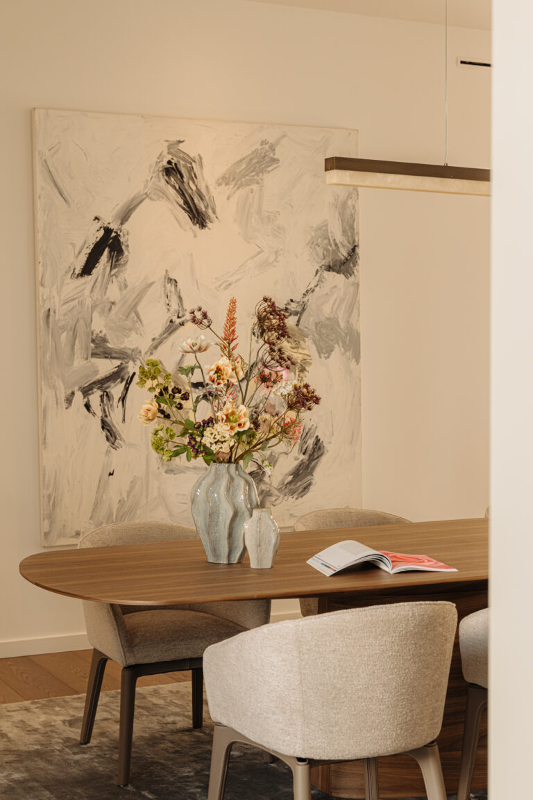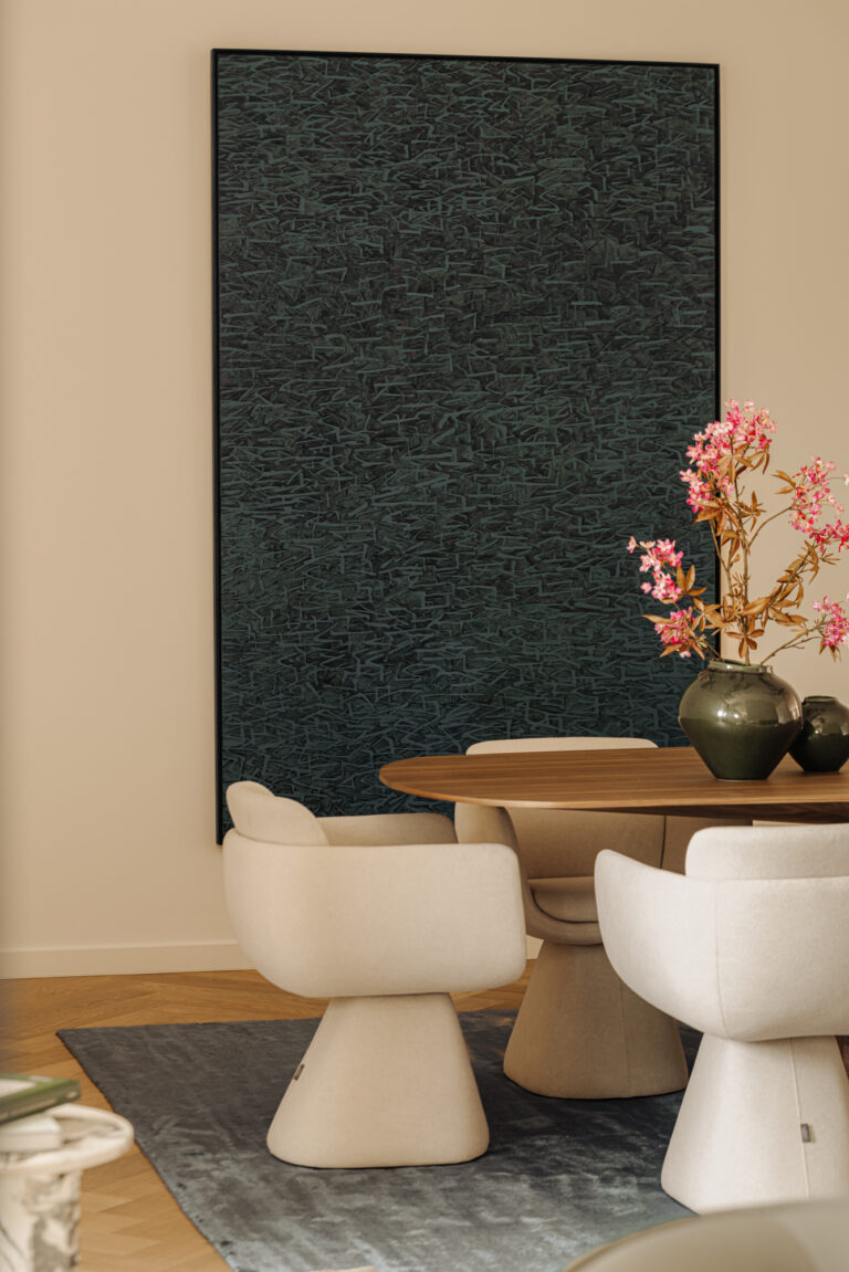 Contrast is essentieel: een uitgesproken kleur tegen een zachte wand, een expressieve vorm in een heldere ruimte. Het interieur wordt een podium waarin kunst de esthetische kracht bepaalt.